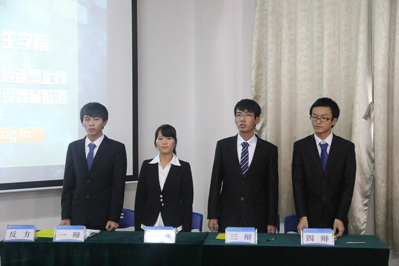 餐厅是否应该禁止设置最低消费这个话题一直在大家口中争论不休,此次的辩手们也就此问题展开激烈的辩论。对这个话题表示支持态度的是正方管理学院的辩手们,他们认为设置最低消费获得的消费额可弥补餐厅的刚性付费需求,而来自化学与生物工程学院的辩手们却认为应该禁止餐厅设置最低消费,设置最低消费是强迫性消费行为,理应禁止。盘问环节和自由辩论环节,双方辩手针对对方的问题进行论述,精彩辩论不时赢得观众掌声。在评委点评、观众提问后,本场辩论赛落下帷幕,管理学院以完整的辩论框架,精彩的辩论取得本场辩论赛的优胜,“最佳辩手”由反方四辩李云帆同学取得。