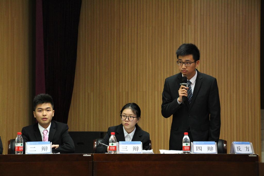 继正方文采斐然、反方慷慨激昂的自我介绍后,比赛进入开篇立论环节。正方代表队首先对己方“成功路上好对手更重要”的观点进行立论陈述。他们指出,好对手更能增强自身的竞争意识,让我们发现不足,完善自身,好对手亦能使我们不断开拓创新。反方则紧紧抓住了“成长不等于成功”这一关键点,分三个方面论述己方“成功路上好伙伴更重要”的观点。第一,好伙伴的精神激励更适合我们;第二,好伙伴有精神、物质、知识等多重的支持;第三,失败的人亦有强劲的对手,而他们之所以失败是因为没有足够好的队友。双方引经据典,妙语连珠,随着赛程的推进,这场没有硝烟的战争愈演愈烈。辩手们精辟的措辞,缜密的思维,出色的口才,引来现场观众的阵阵掌声与赞叹。经过精彩的观众提问环节后,五位评委对本次辩论赛做了精彩的点评,他们指出双方的优点和不足,并表示期待大家的进步。最终,反方广西师范大学辩论队赢得了本场比赛的胜利。反方四辩袁安邦凭借出色的反应能力获得本场辩论赛“最佳辩手”的称号。