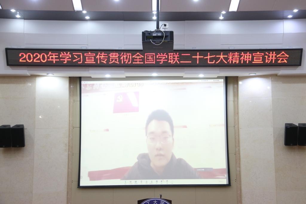 宣讲会上,全国学联二十七大代表、广西学联驻会执行主席刘文博同学通过网络连线的方式,结合自己参加全国学联二十七大会议的亲身感悟,就全国学联二十七大会议精神作全面解读,围绕学联学生会的定位职能、基本任务、深化改革的前进方向、从严治会的有关要求等四方面深入剖析了当前和今后一个阶段学联学生会前进方向和总体部署。