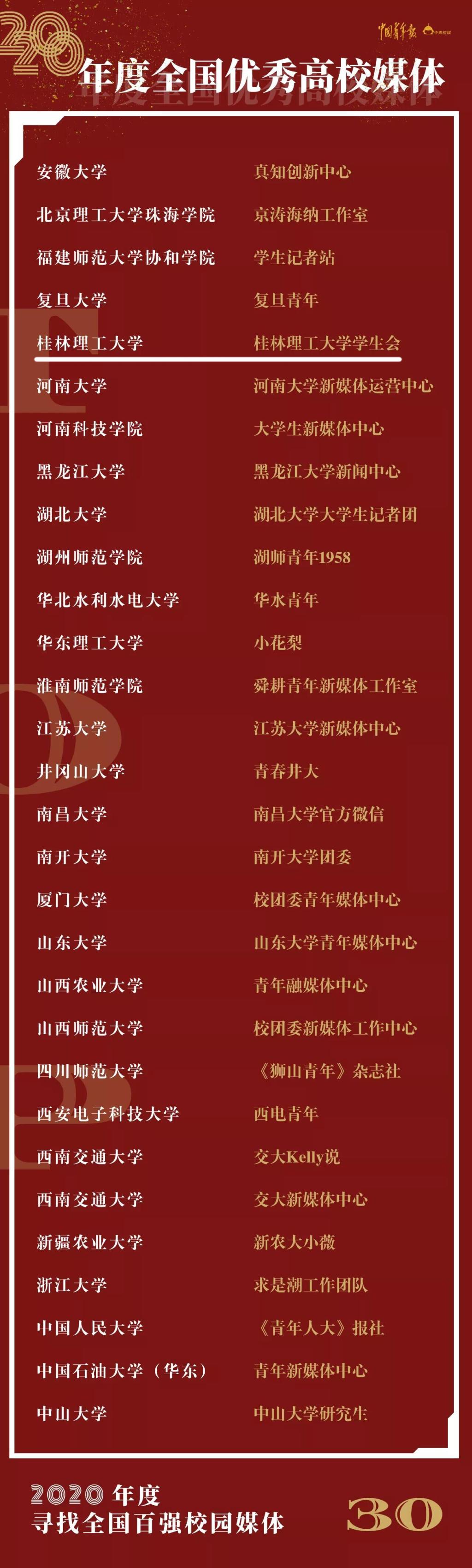 近日,中国青年网发布了“2020寻找全国百强校园媒体”获奖名单,我校学生会微信公众号在全国一千多余家高校媒体中脱颖而出,荣获“2020年度全国优秀高校媒体”荣誉称号,是广西唯一获得此项荣誉称号的高校媒体。我校学生会微信公众号已连续三届在全国百强校园媒体活动中获奖。