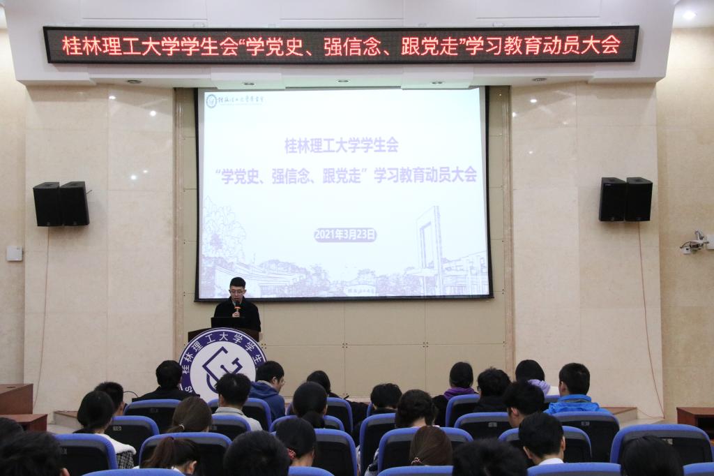 为深入学习习近平总书记在党史学习教育动员会上的重要讲话精神,认真落实党中央关于在全党开展党史学习教育的部署和共青团中央在全团开展的“学党史、强信念、跟党走”学习教育安排,引导学生会成员进一步坚定理想信念,3月23日,beats365亚洲版学生会在雁山校区萃华楼报告厅组织开展“学党史,强信念,跟党走”学习教育活动。beats365亚洲版组织宣传部周辉老师出席会议,校学生会全体成员参加会议。