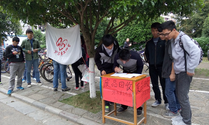 27日下午17:30,分享爱工作营的志愿者们就开始在设点处布置,一号为10A对面,二号为24栋对面,并向来往的同学们介绍此次的活动及目的。不少同学留下了宿舍号,甚至直接引领分享爱工作营的志愿者去宿舍,将平时收集的废品回收,同时表示今后愿意继续收集废品,为麻风病康复者贡献出自己的一份力。