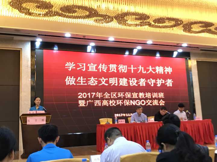 为了更深刻学习贯彻党的十九大精神,加快广西生态文明建设,自治区环境保护厅于11月3日在南宁市成功举办2017年全区环保宣教培训班暨广西高校环保NGO交流会,环境保护厅领导、各处室及直属单位宣传人员、各市环境保护局分管宣传的领导、各市各高校环保社团负责人受邀出席本次交流会现场,我校环境学院团委副书记唐红兵老师携绿色环保协会会长陶燕与环境学院学生会副主席黄舒婷参加了此次交流会。
