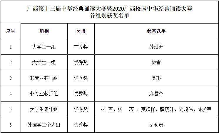 近日,广西第十三届中华经典诵读大赛暨2020广西校园中华经典诵读大赛获奖名单公布。在本次比赛中,我校获得二等奖1项,优秀奖5项,学校荣获优秀组织奖,郭彦汝老师获优秀指导教师奖。