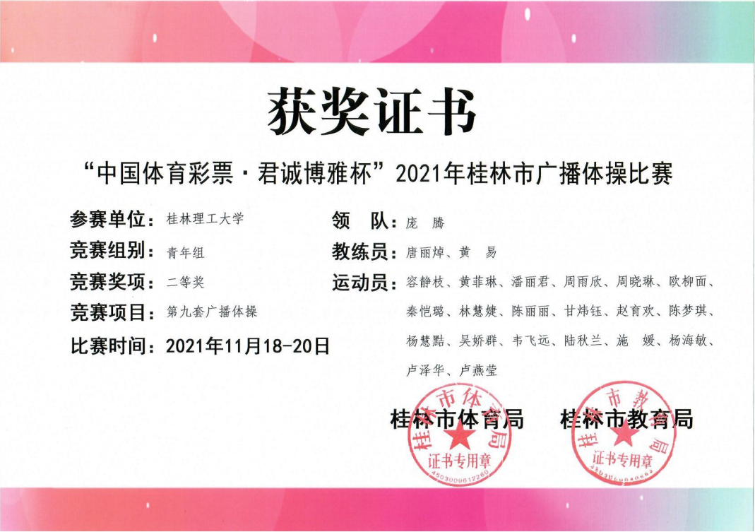 近日,中国体育彩票·君诚博雅杯”2021年桂林市广播体操比赛结果揭晓。本次比赛采用线上参赛、线下评审方式举行。我校学子以朝气蓬勃的精神面貌一路披荆斩棘,在青年组中获二等奖的好成绩。