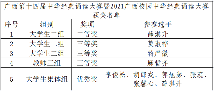 日前,自治区语委、自治区教育厅发布《关于公布广西第十四届中华经典诵读大赛暨2021广西校园中华经典诵读大赛获奖名单的通知》(桂语【2021】12号)。根据文件,我校师生在总决赛中获奖7项。其中,学生组获个人二等奖一项,三等奖两项,学生集体组获优秀奖一项;教师个人组获三等奖一项;优秀指导教师1人,我校荣获优秀组织奖。