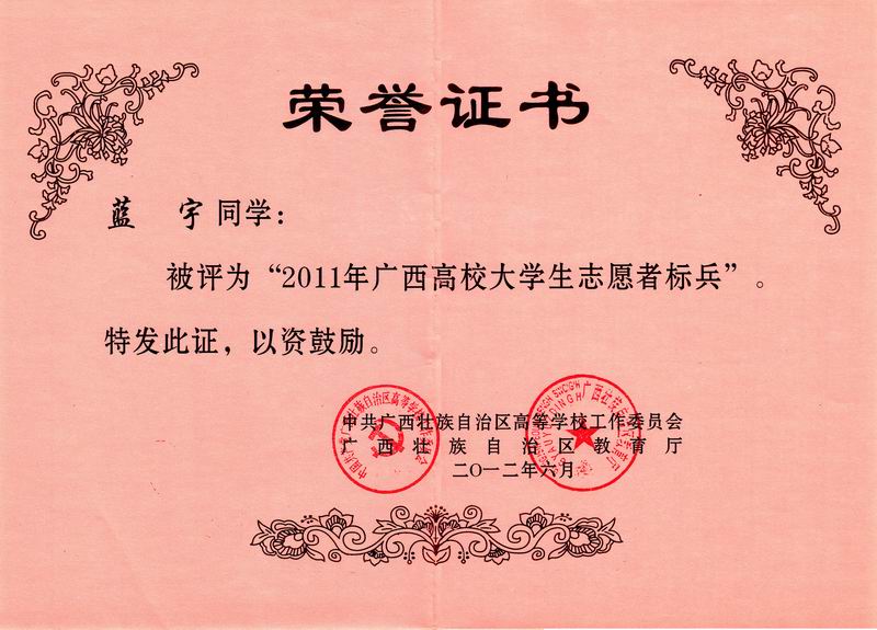 我校青年志愿者协会会长蓝宇荣获“广西高校大学生志愿者标兵”