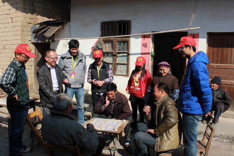 张老师和志愿者们观看老人下象棋