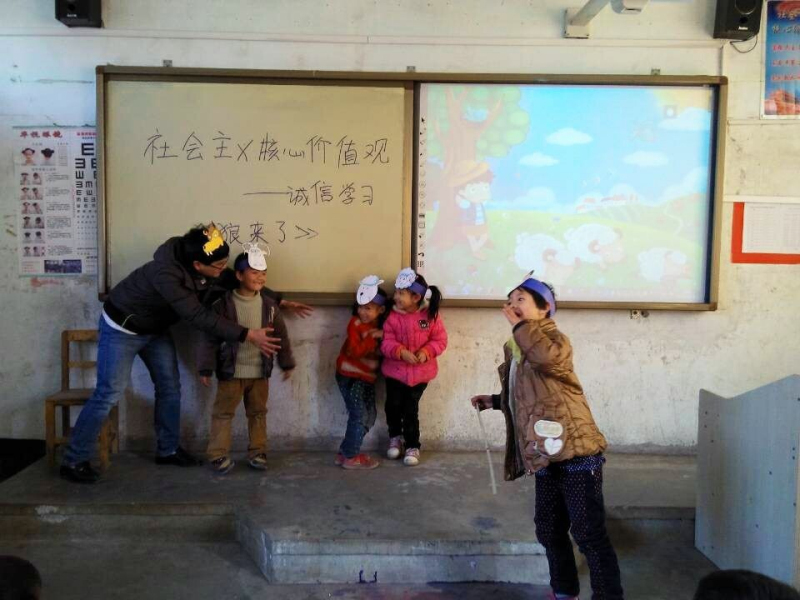 将理论学习融入学生喜闻乐见的校园文化活动情景剧,吸引了很多孩子参与,支教团的成员和一年级(1)班的孩子共同参与,以风趣幽默的语言以及生动的演技将《狼来了》的故事演绎的淋漓尽致。此剧以一个放羊娃为切入点,用惨痛的结果使孩子们潜移默化的意识到诚实守信的重要性,为学生们带来了一场独具特色的视听盛宴。