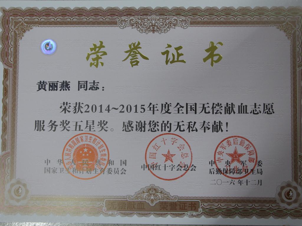 据了解,无偿献血志愿服务奖主要用于奖励积极参与无偿献血志愿服务工作的个人,按照个人参与无偿献血服务时间多少来评定,共分一星级到五星级。经全国无偿献血表彰奖励评定小组的评审,我校共有16人获得全国2014-2015年度无偿献血志愿服务奖,其中获得“三星级”称号5人、“五星级”称号11人。