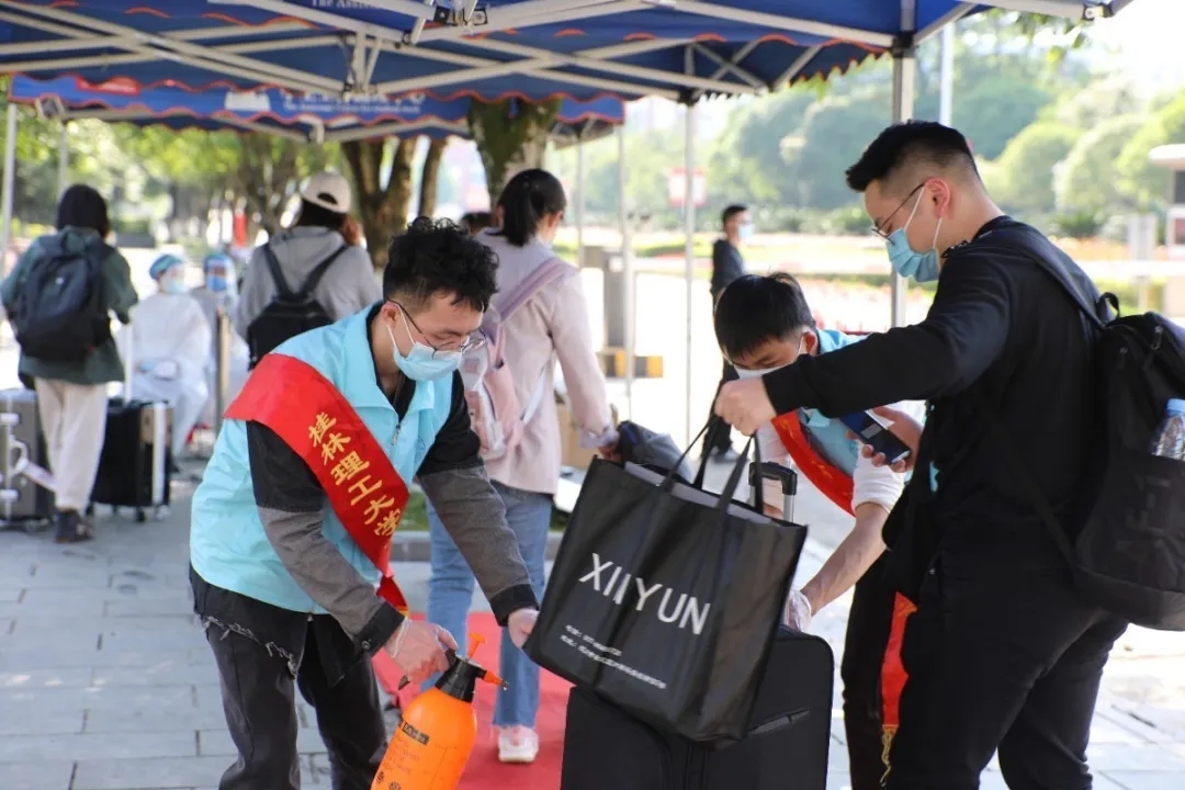 在志愿活动中,志愿者积极配合学校执行入校扫码核验、测量体温、手部消毒、行李消毒、更换新口罩等工作,用贴心的服务迎接每一位返校的同学;在食堂、教学楼栋、校园内等人员密集场所进行秩序引导、防疫宣传、场所消毒等志愿服务,“桂工蓝”在自己的岗位上尽心尽责,兢兢业业,奋战在我校疫情防控一线,共同建设安全校园。