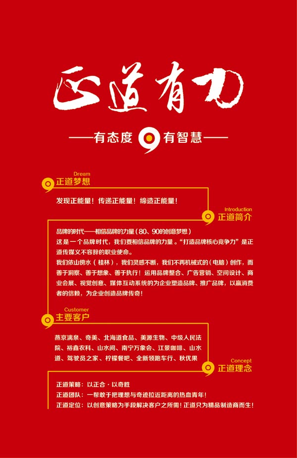 这是一个品牌时代,我们要相信品牌的力量。“打造品牌核心竞争力”是正道传媒义不容辞的职业使命。我们依山傍水 ( 桂林),我们灵感不断,我们不再机械式的(电脑)创作,而善于洞察、善于想象、善于执行!运用品牌整合、广告营销、空间设计、商业会展、视觉创意、媒体互动系统的为企业塑造品牌、推广品牌,以赢消费者的信赖,为企业创造品牌传奇!