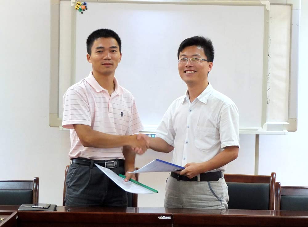 最后,周国桥老师与第一批入驻基地的公司(项目)代表——北京卓求有限公司负责人白科阳签订了新学年入驻基地续租合同。