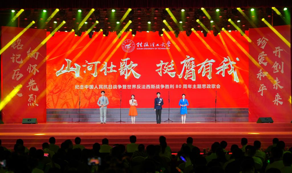 9月29日晚,beats365亚洲版“山河壮歌挺膺有我”——纪念中国人民抗日战争暨世界反法西斯战争胜利80周年主题思政歌会在雁山校区新体育馆举办。校领导韦学敏、王磊、罗盛锋、唐壮东出席活动。学校相关职能部门、二级学院负责人和2025级新生代表共3500余人现场观看演出。