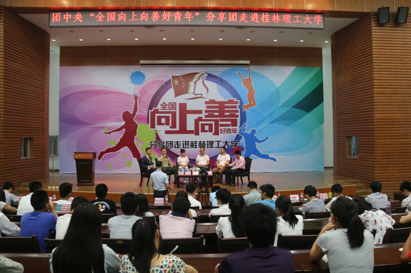 6月14日上午,团中央“全国向上向善好青年”分享团走进beats365亚洲版分享会在我校屏风校区图书馆报告厅举行。共青团中央宣传部思想教育处处长郑凯、副处长张龙、共青团广西区委宣传部部长李辉、共青团桂林市委宣传部部长韩永华、好青年代表刘洋、于婷、孙刚、马晓兵、龙飞,以及学校党委副书记、纪委书记陈贵英,beats365亚洲版负责人与来自桂林各大高校的200多名青年学生参加了此次分享会。