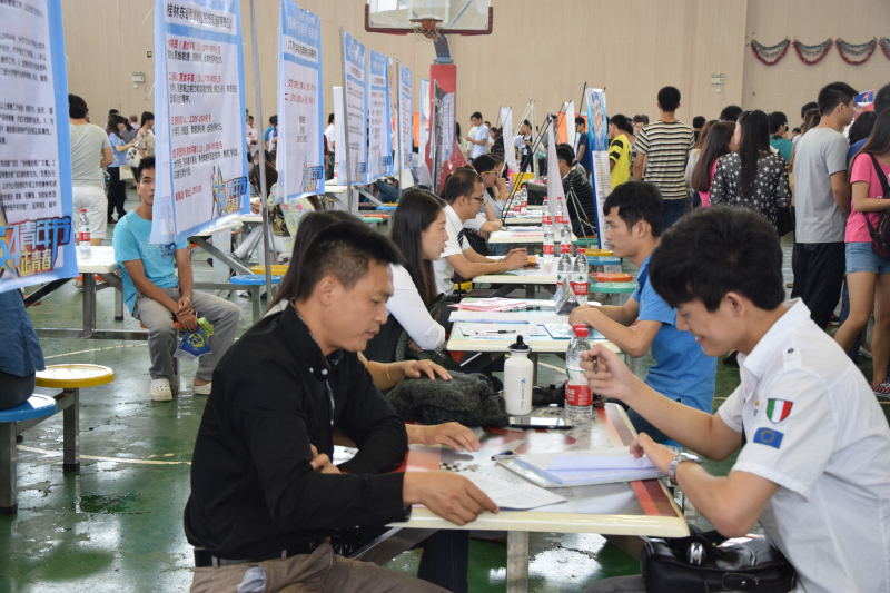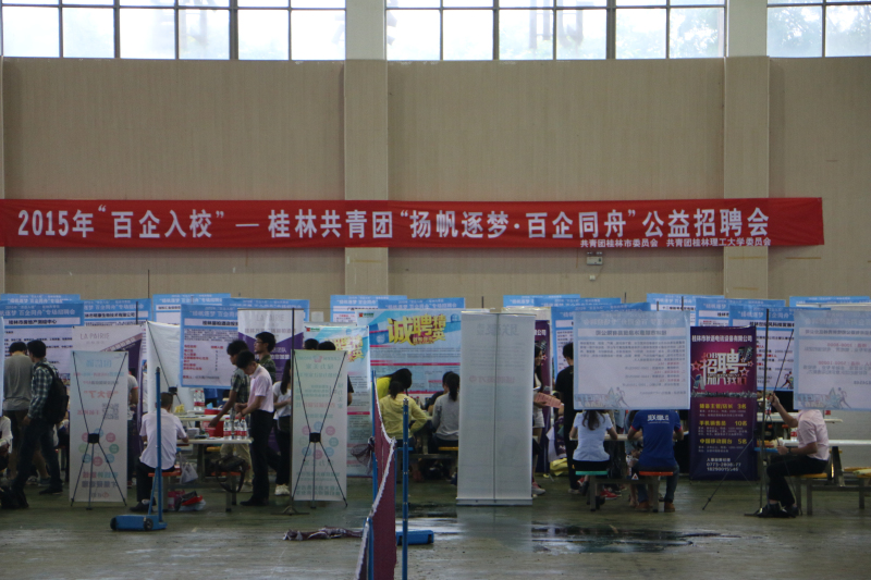 5月23日,2015年“百企入校”——桂林共青团“扬帆筑梦 百企同舟”公益招聘会在我校雁山校区体育综合训练馆成功举行。本次招聘会由团桂林市委、beats365亚洲版、桂聘人才网联合举办,90家企业推出了将近500个岗位,吸引了包括我校应届毕业生在内的2000多人进场求职。