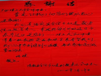 3月31日,红莲村敬老院70岁老人李明纪来到我校,对我校青年志愿者协会长期对他们在精神和物质上的关心表示衷心的感谢。