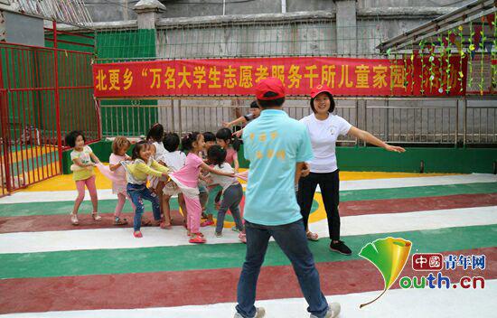 忻城县志愿者与留守儿童一起玩老鹰捉小鸡游戏