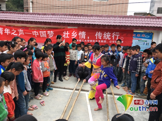 研支团成员带领学生学跳竹竿舞