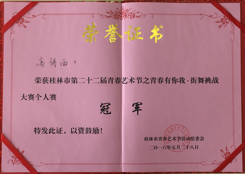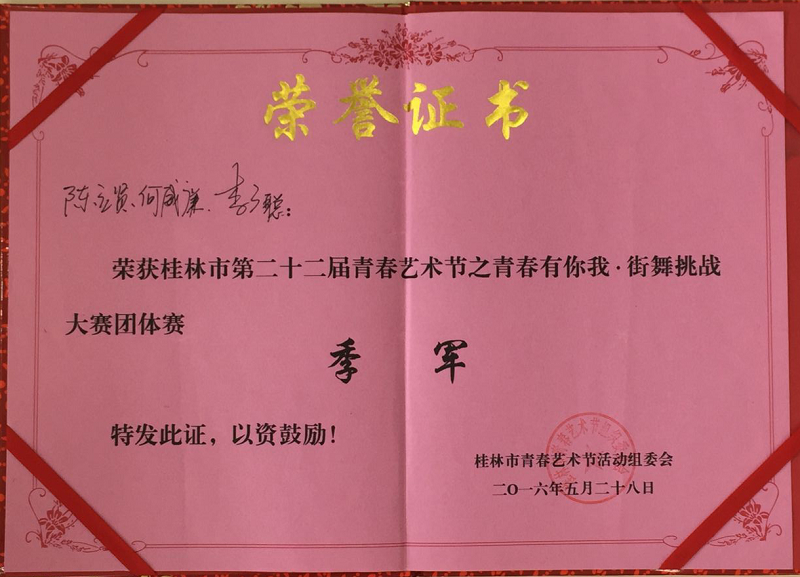 近日,桂林市第二十二届青春艺术节暨2016年青年创业创新文化节圆满落幕。经过激烈角逐,我校代表分获“青春有你我街舞挑战大赛”个人赛冠军、团体赛季军,我beats365亚洲版荣获“桂林市第二十二届青春艺术节”最佳组织奖。