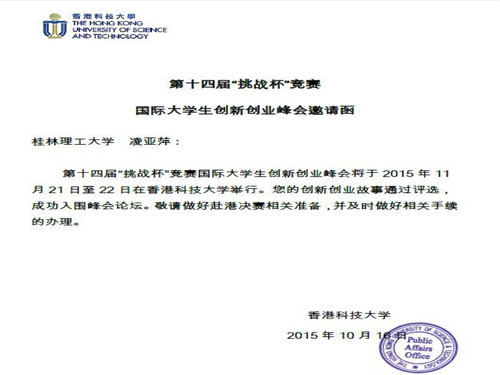 11月21-22日,国际大学生创新创业峰会在香港科技大学举行,管理学院房地产经营与管理12-2班凌亚萍同学作为广西区唯一学生代表应邀参加了此次峰会。本次峰会是第十四届“挑战杯”中航工业全国大学生课外学术科技作品竞赛的系列活动之一,主题为“青年大学生创新创业能力的培养”,有来自内地70多所高校,5个省级团委的近200名师生赴港参与,峰会收录优秀师生论文近160篇,此外,还吸引了来自香港地区及国际各高校近200名学生参加。
