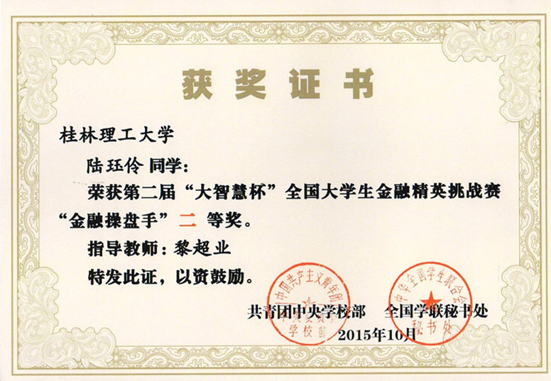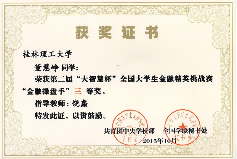 近日,从第二届“大智慧杯”全国大学生金融精英挑战赛组委会处传来喜讯,我校管理学院学生在比赛中取得优异成绩,陆珏伶等4名学生获得全国高校金融操盘手二等奖,蕫慧峥、梁华作、冼学宁等34名学生获得全国高校金融操盘手三等奖。