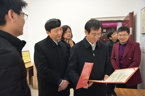 赵艳林主席(前中)在校领导陪同下参观大学生创新创业基地入住企业