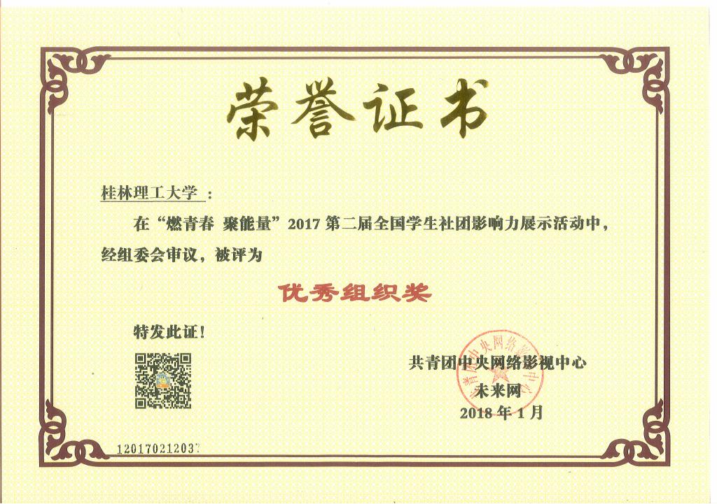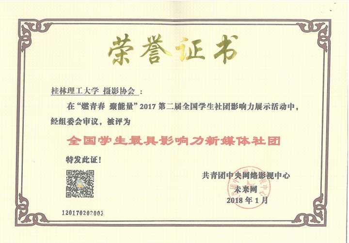 近日,由共青团中央网络影视中心与未来网联合主办的“燃青春 聚能量”2017年全国大中专学生社团影响力评选活动圆满落幕。我校获得多项荣誉,其中,学校荣获“优秀组织奖”,校大学生社团联合会荣获“全国学生最具影响力社团联合会”,摄影协会荣获“最具影响力媒体社团”。