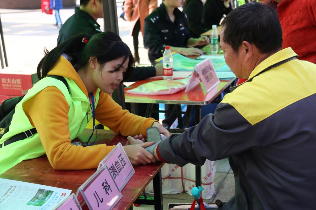 志愿者在医生的指导下为社区居民免费测量血压血糖