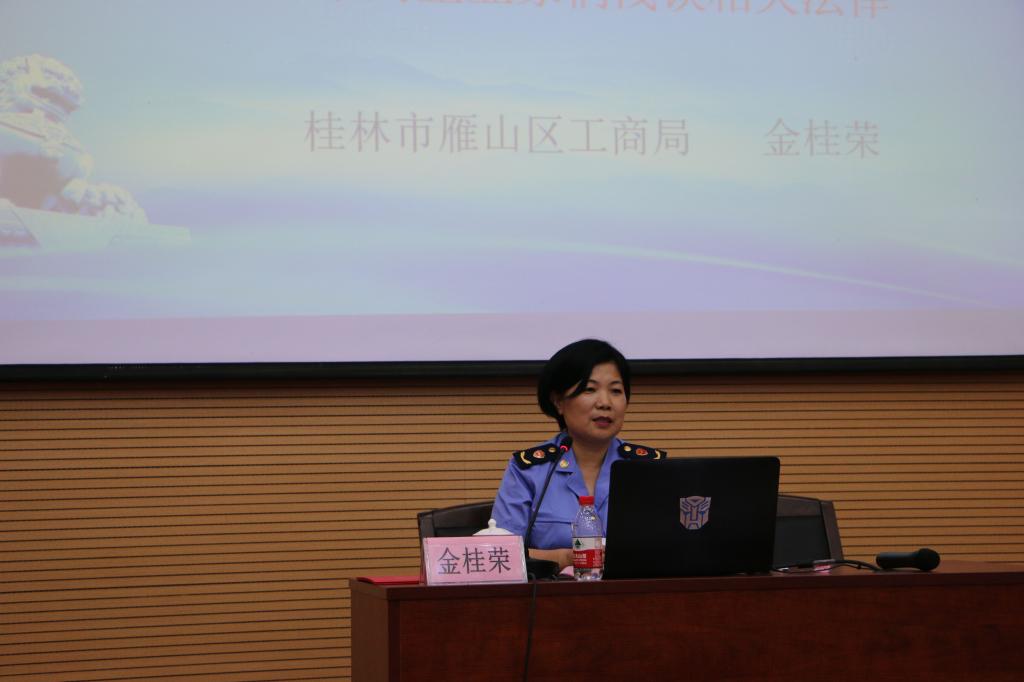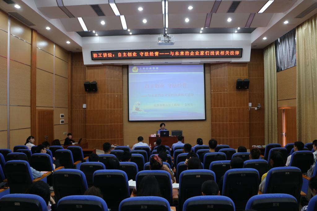 为进一步引导和帮助广大同学掌握创业知识,提高创业能力,增强法律意识,5月10日下午,应学校大学生创新创业基地管理委员会邀请,桂林市雁山区工商局副局长金桂荣在雁山校区12栋萃华楼报告厅作了题为“自主创业 守法经营——与未来的企业家们浅谈相关法律”专题报告,beats365亚洲版副书记潘思伊、雁山区工商局登记股副股长杨林丹、雁山区工商局经检大队副队长李彩日、学校勤工助学服务公司负责人吴优参加了报告会。学校大学生创新创业基地企业代表、勤工助学服务公司骨干代表、创业学生代表150余人聆听了报告会。