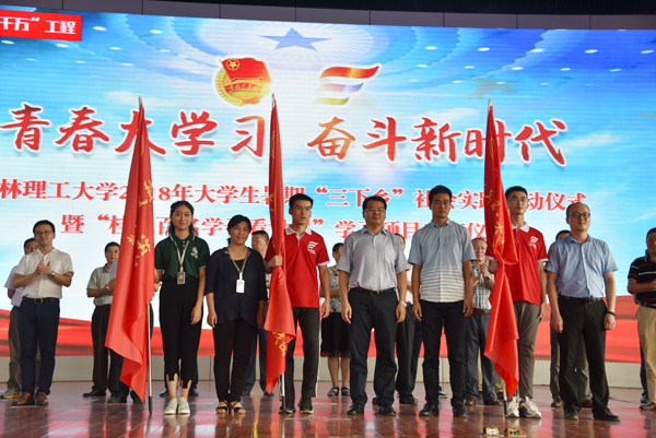 启动仪式上,2018年区青马培训班学员高昌洪同学带领全体参与社会实践师生进行宣誓,校领导以及学校相关部门负责人为我校2018年大学生暑期“三下乡”社会实践团队和“桂工百名学子看世界”学习项目团队进行授旗。