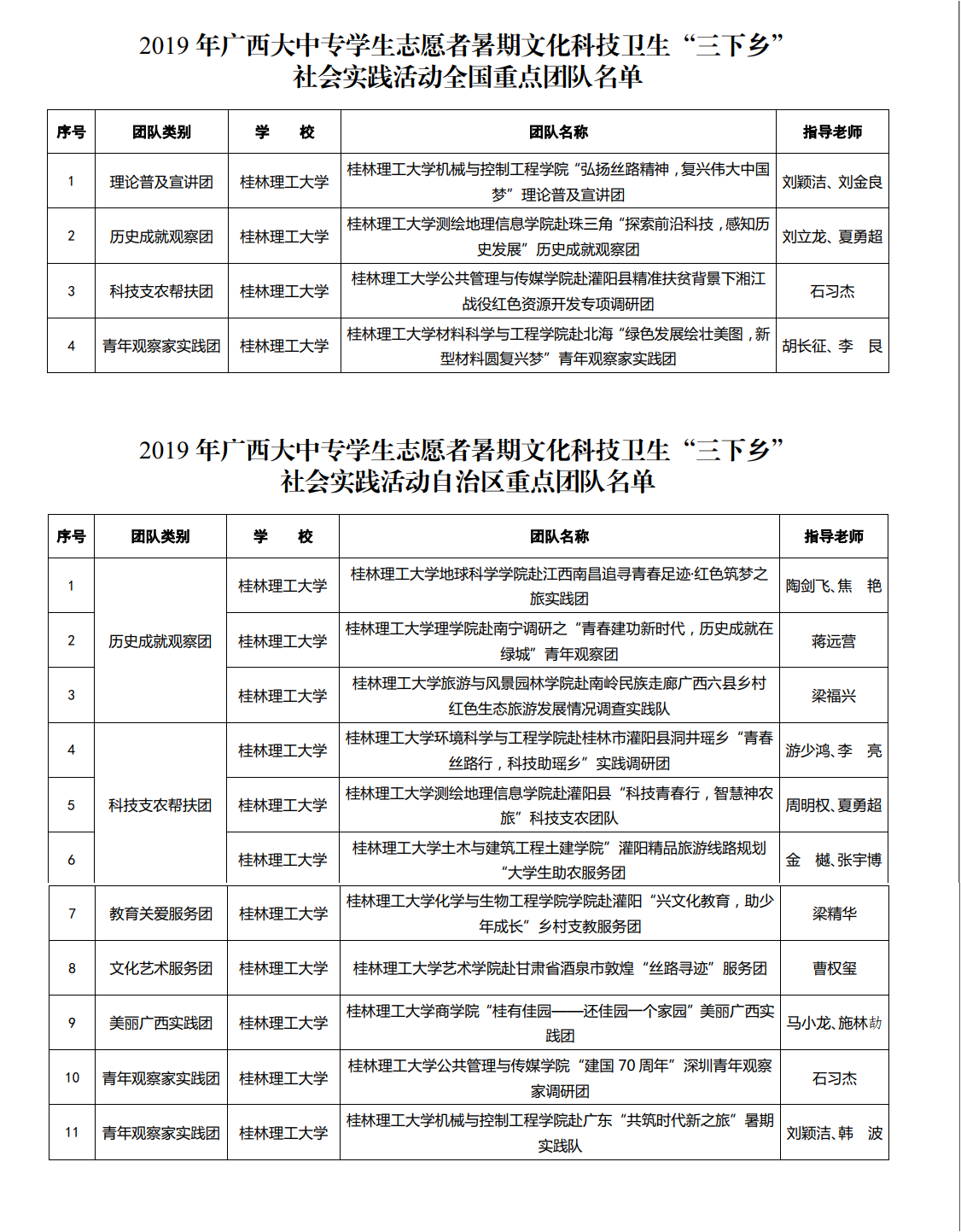 近日,自治区党委宣传部、自治区精神文明办、自治区教育厅、团区委、自治区学联联合发布《关于公布2019年广西大中专学生志愿者暑期文化科技卫生“三下乡”社会实践活动重点团队名单的通知》,公布了今年暑假社会实践活动重点团队名单。我校共有15个团队入选2019年广西大中专学生志愿者暑期文化科技卫生“三下乡”社会实践活动全国、自治区重点团队名单,其中,beats365亚洲版机械与控制工程学院“弘扬丝路精神,复兴伟大中国梦”理论普及宣讲团等4个团队入选全国重点团队;beats365亚洲版地球科学学院赴江西南昌追寻青春足迹·红色筑梦之旅实践团等11个团队入选自治区重点团队。