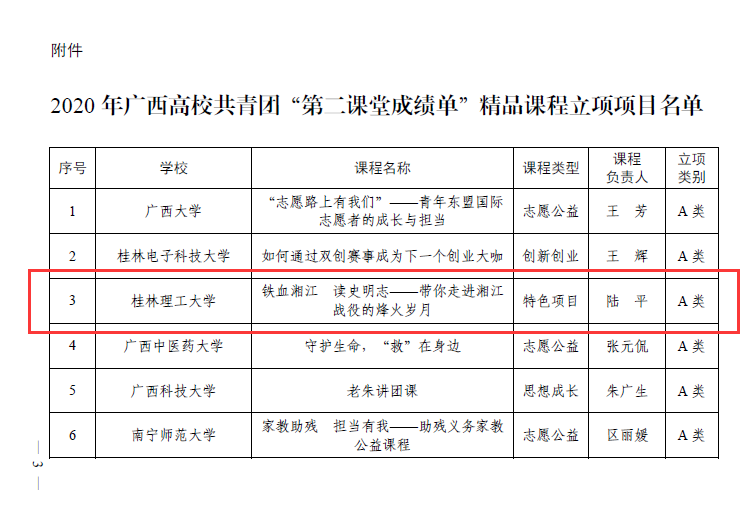 近日,共青团广西区委、自治区教育厅发布了《关于组织申报2020年广西高校共青团“第二课堂成绩单”精品课程的通知》(桂青联发〔2020〕8号),我校报送的《铁血湘江,读史明志——带你走进湘江战役的烽火岁月》“第二课堂成绩单”精品课程项目,通过了层层遴选,荣获自治区“特色项目类”第二课堂精品课程A类立项。