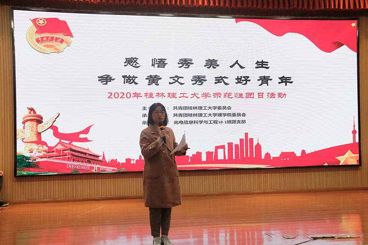 首先,光电信息科学与工程2018-1团支部团支书李丽为团员青年生动的讲述了黄文秀的生平事迹,并由四名支部成员朗诵《黄文秀礼颂》,让在座人员感受到了“以青春之我,成就青春之中国”的时代强音。紧接着,主持人带领观众观看了黄文秀生平事迹的汇编视频,同学们积极分享了自己对黄文秀精神的认识以及看完视频后的触动和感悟,大家对黄文秀“不获全胜,决不收兵”的坚定信念和伟大精神有了更深的理解和体会。