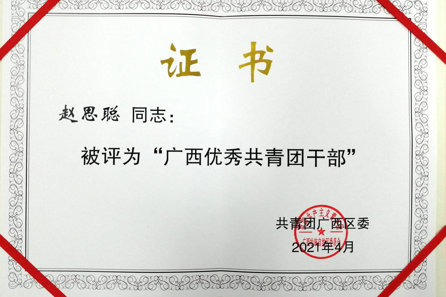 广西优秀共青团干部证书