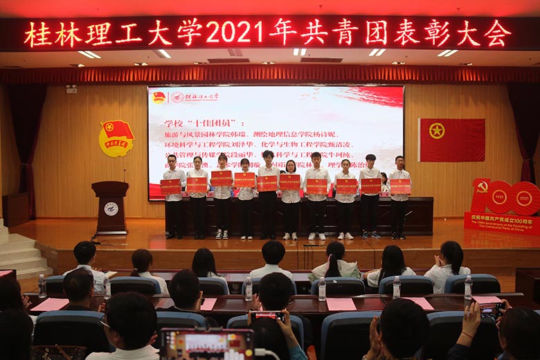 随后进行颁奖仪式。与会领导分别为荣获2020年度全国和广西“两红两优”先进集体代表和先进个人、2020年度桂林市“两红两优”先进集体代表和先进个人、2020年度学校共青团“十佳”系列先进集体和先进个人、2020年在各类创新创业及校园文化活动中获奖的先进集体和先进个人颁奖。