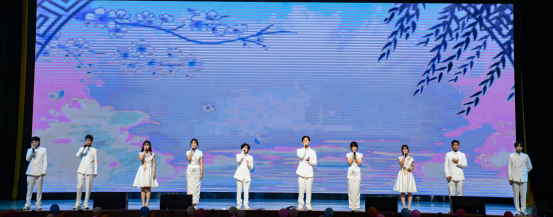 第二篇章——“艺行展风采”。模特队《国韵锦裳》展现东方的国风神韵;纯人声《青花瓷》天籁般的纯美歌声带给听众的更是无与伦比的听觉盛宴;《站在草原上望北京》展现了蒙古族舞蹈的舒展与豪迈。