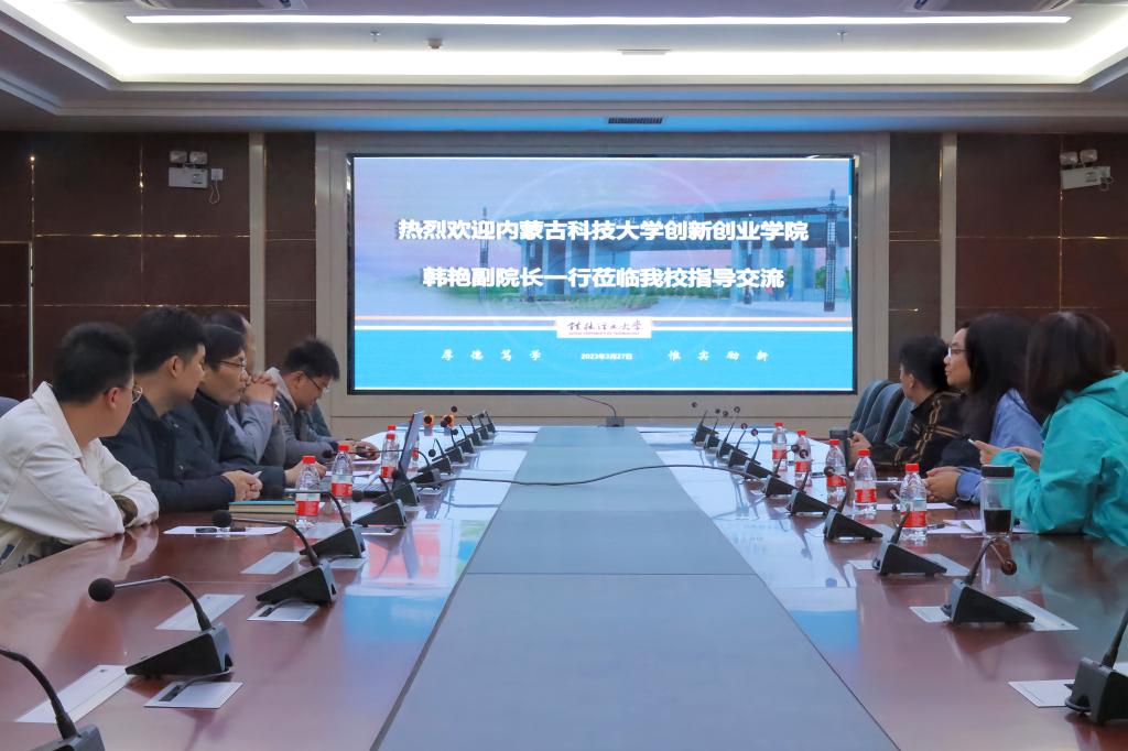 唐国强对韩艳一行表示热烈欢迎,并简要介绍了学校近年来深化创新创业教育改革取得的成果和大学生创新创业园的建设情况。韩艳一行对我校的热情接待表示感谢,并介绍了内蒙古科技大学创新创业教育相关情况及来访目的,希望能通过此次交流促进创新创业教育工作的开展。与会双方还就创新人才培养、创新创业教育改革、平台搭建等工作进行了深入探讨和交流。