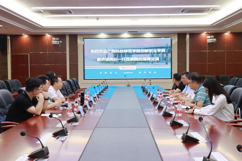 饶蠡对广西科技师范学院创新创业学院的到来表示热烈欢迎,并简要介绍了学校近年来深化创新创业教育改革取得的成果和平台建设情况。谢济运对我校的热情接待表示感谢,并介绍了广西科技师范学院创新创业教育相关情况及来访目的。与会双方还就创新创业教育改革、平台建设、教学管理、赛事组织等方面内容展开了深入交流。