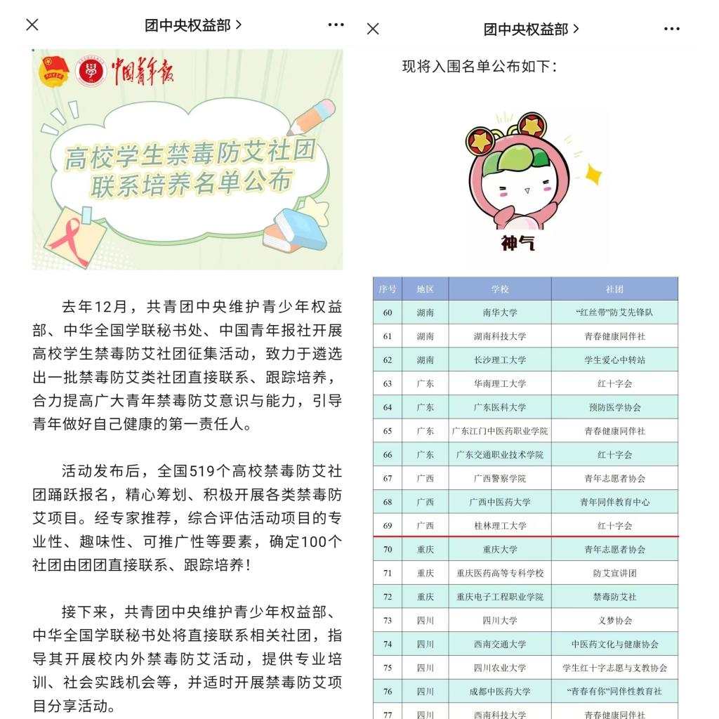 近日,共青团中央维护青少年权益部、中华全国学联秘书处、中国青年报社公布了全国高校学生禁毒防艾社团联系培养名单,我校学生社团红十字会成功入选,全区共三所高校学生社团入选。