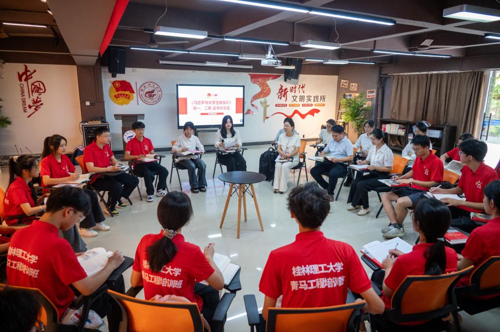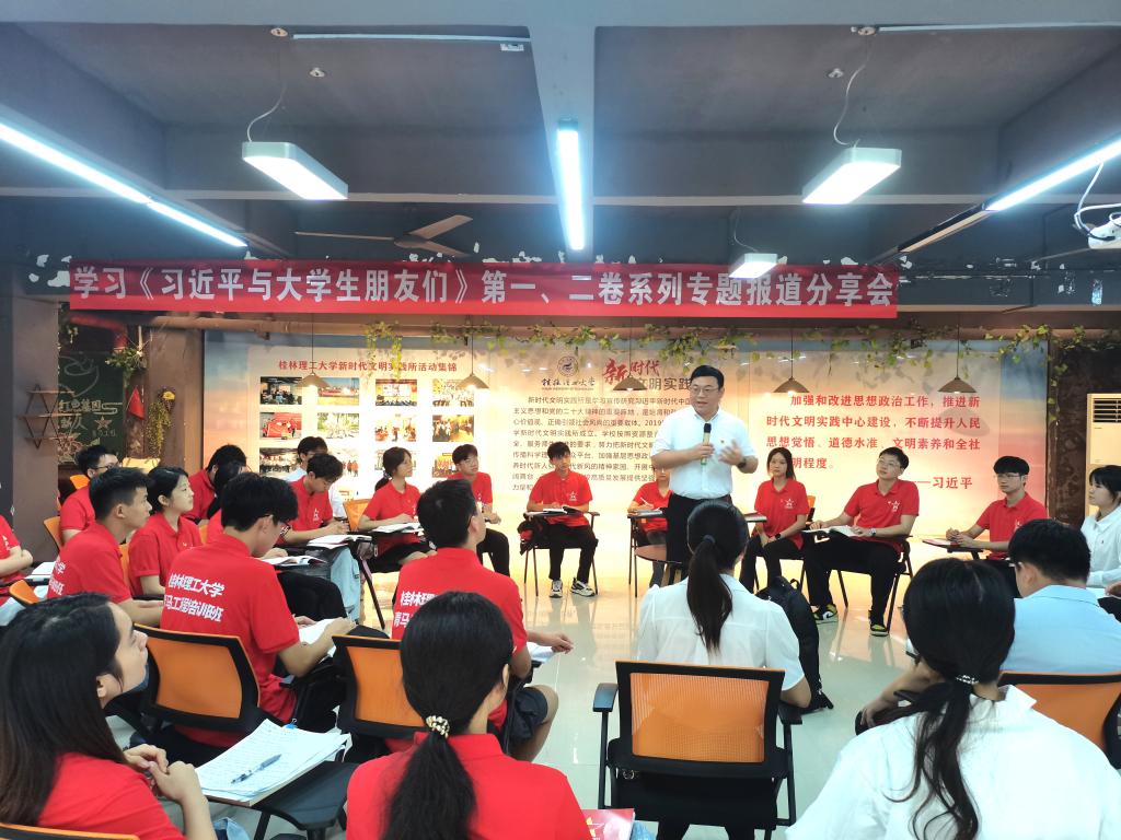 为深入学习贯彻习近平总书记关于青年工作的重要思想和关于教育的重要论述,9月14日上午,我校“青马工程”培训班在雁山校区青马书屋举办《习近平与大学生朋友们》第一、第二卷读书分享会,学beats365亚洲版书记潘思伊、副书记慕宗良,马克思主义学院思政课教师、党委副书记马彬彬出席活动。学校专职团干部代表、第十三期“青马工程”培训班学员代表、校级学生组织骨干代表共50余名师生参加。