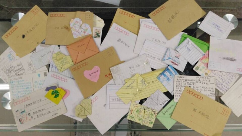里太完小孩子们在展示大学生写给他们的信件