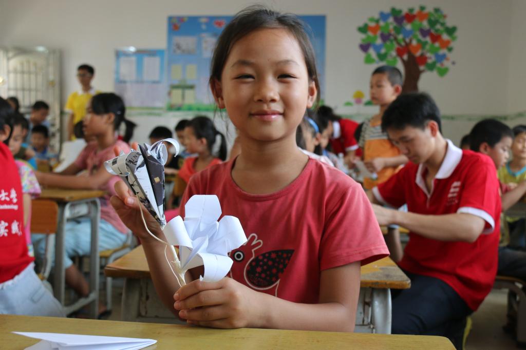 小女孩拿着手里刚刚完成的作品,向志愿者展示着自己成功的作品,脸上露出了灿烂的笑容,眼睛笑得像弯弯的月儿,十分的招人喜欢。
