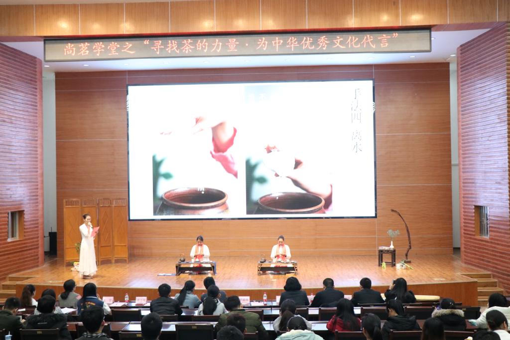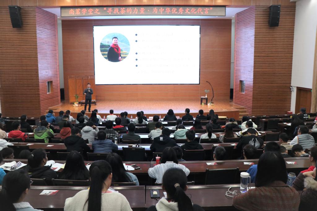 11月28日晚,由大学生创新创业基地事务管理中心及基地在孵企业——桂林卓求旅游文化创意有限公司联合承办的尚茗学堂之系列活动——"寻找茶的力量,为中华优秀文化代言"在屏风校区图书馆报告厅举办,全校近300名学生参加了本次活动。