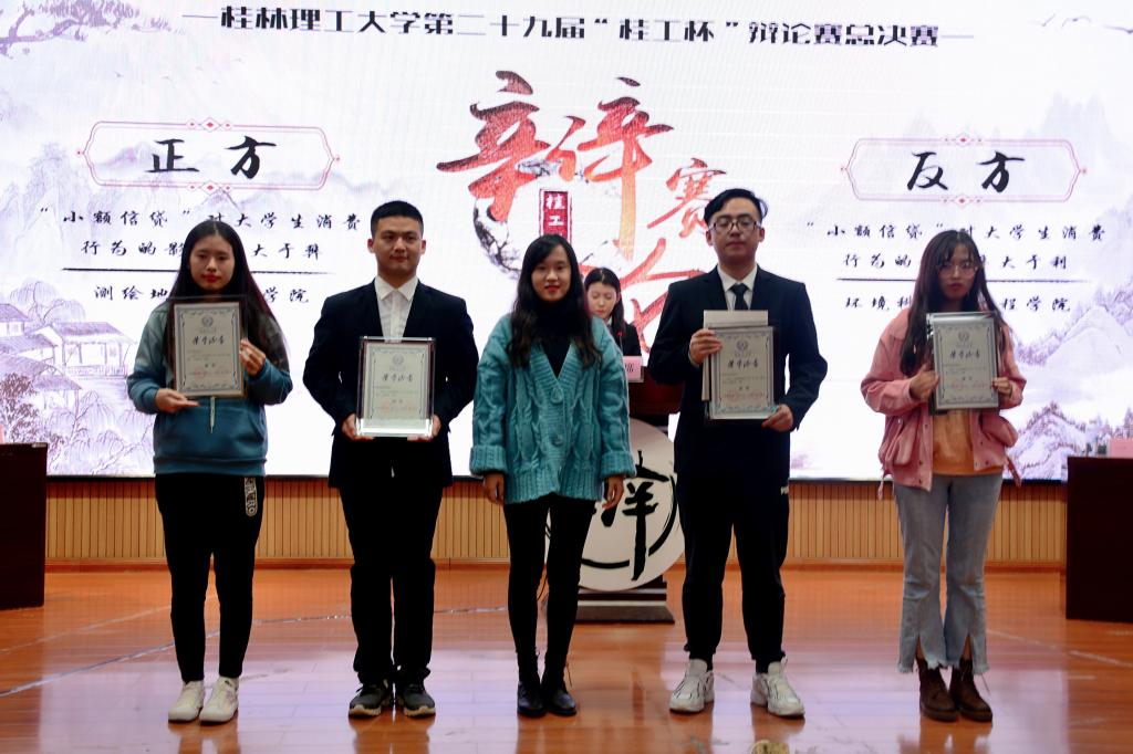 本场辩论赛中,双方就“小额贷款对大学生消费行为的影响”这一主题展开辩论。正方测绘地理信息学院辩论队先提出小额贷款能使人获得有益成长的论点,紧接着,反方环境科学与工程学院以贷款存在的风险展开驳论。辩手们巧用数据,侃侃而谈,举例切合实际,探讨深入人心,赢得了阵阵掌声。最终,反方环境科学与工程学院辩论队获得了第二十九届“桂工杯”辩论赛总冠军,正方三辩刘润泽获得“最佳辩手”的称号。随后,举行了隆重的颁奖仪式。