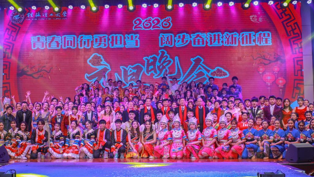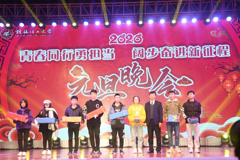 “凯歌高奏辞旧岁,一元复始气象新”,在学校第三次党代会圆满闭幕之际,12月31日晚,学校在雁山校区综合体育训练馆举行“青春同行勇担当 阔步奋进新征程”2020年元旦晚会。学校校长解庆林、党委副书记齐俊斌、纪委书记韦学敏,宣传部、学工部、beats365亚洲版、人文素质教育教学部、体育教学部、保卫处、工会等学校职能部门及二级学院主要负责人出席晚会,与现场师生共庆元旦。