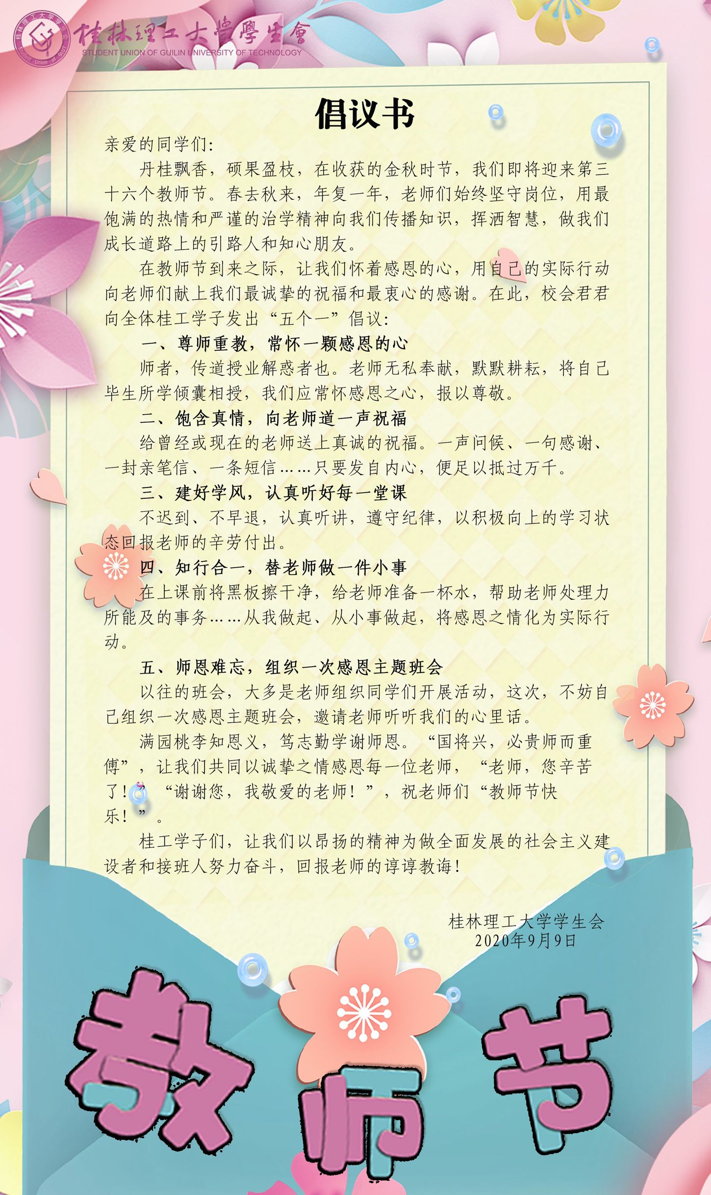 在教师节到来之际,让我们怀着感恩的心,用自己的实际行动向老师们献上我们最诚挚的祝福和最衷心的感谢。在此,校会君君向全体桂工学子发出“五个一”倡议: