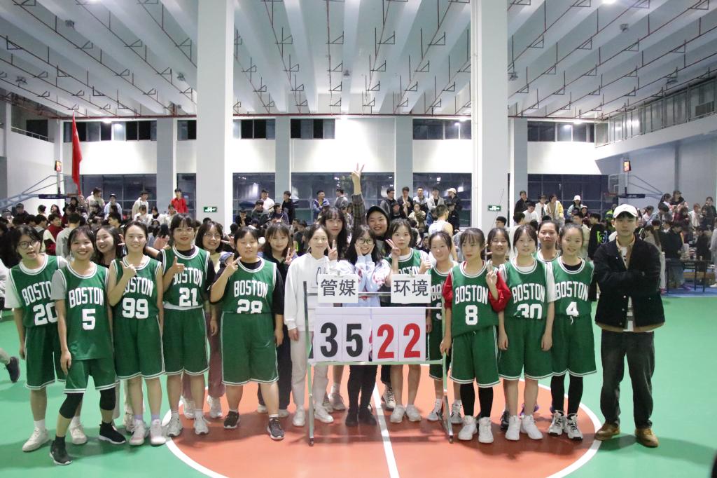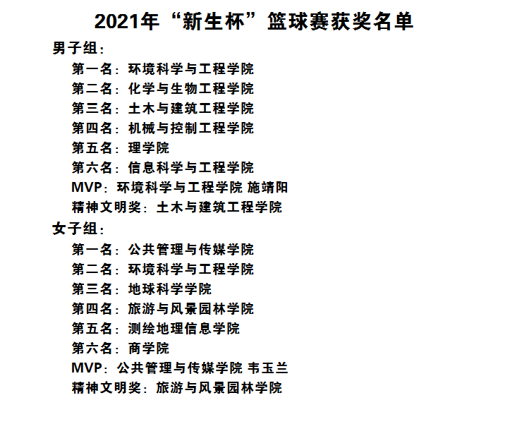 本次“新生杯”篮球赛共有14个学院参加,比赛实行轮回赛制,胜者晋级。赛场上球员们积极投入,顽强拼搏,全力以赴,坚持不懈的挥洒着汗水;场下啦啦队员为运动员们呐喊助威,加油声此起彼伏,一场场扣人心弦的比赛赢得了观众阵阵喝彩。各学院队员赛出了风格,赛出了水平,经过激烈的角逐,环境科学与工程学院男篮代表队、公共管理与传媒学院女篮代表队分别夺得了本届“新生杯”篮球赛男女篮桂冠。
