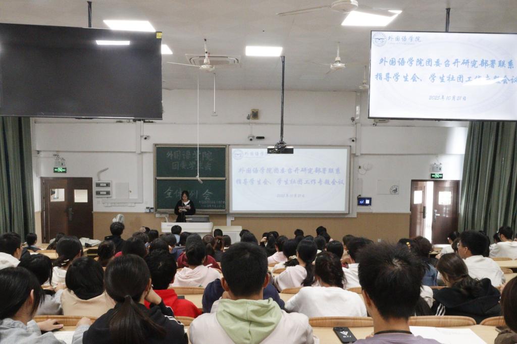 为进一步加强对学生会、学生社团的指导与管理,推动学生组织工作高质量发展,2025年10月21日,外国语学院团委召开专题工作会议,研究联系指导学生会、学生社团相关工作。学院团委彭广生、韩笑老师,团委、学生会全体成员及各学生社团负责人参加会议。