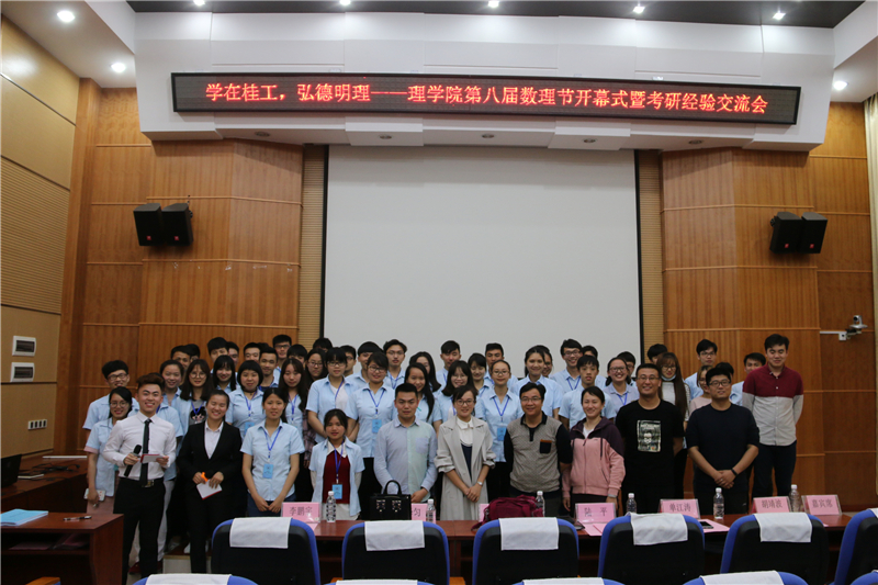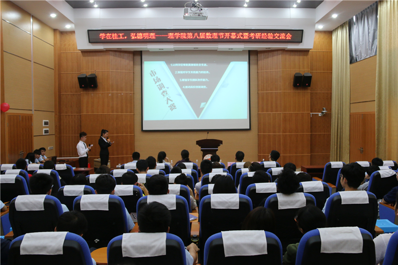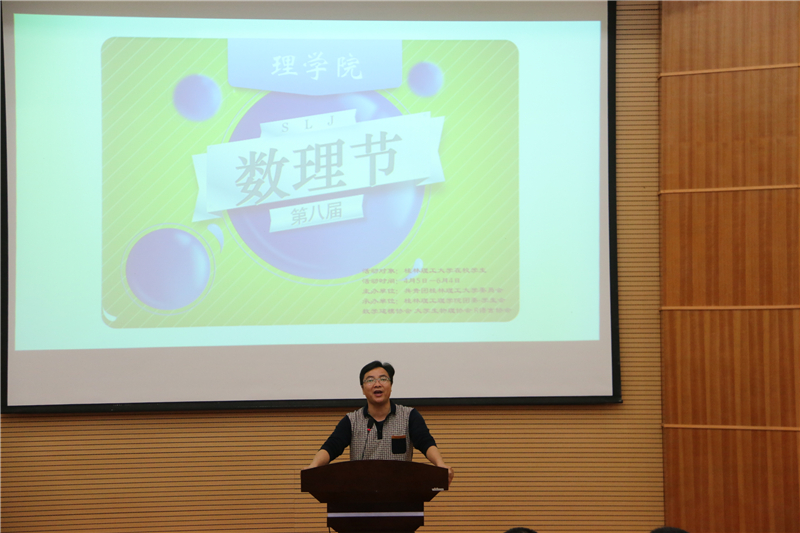为彰显理学院专业特色,传承数理文化,一年一度的理学院学生文化活动盛宴——“数理节”于2016年4月18日14:30在雁山校区12栋报告厅盛大开幕。理学院党委书记陆平、党委副书记孙巍、团委书记单江涛、各年级辅导员、各兄弟学院学生会主席以及我院各级学生组织代表应邀出席了本次开幕式。